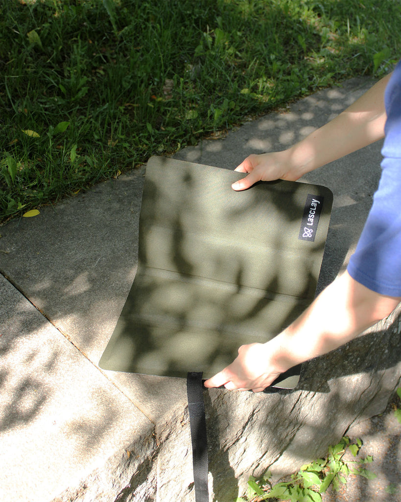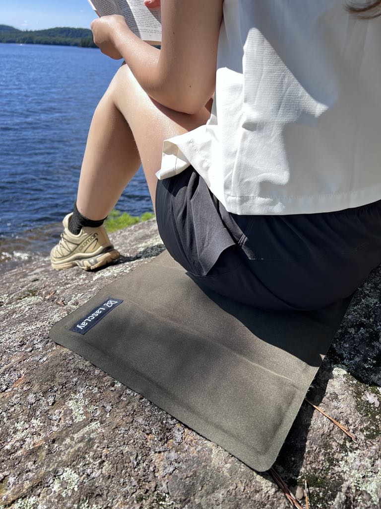 Ce coussin d'assise isolé est facilement transportable grâce à sa ganse à velcro, qui permet de le maintenir plié en quatre. Pesant seulement 150 grammes et fait de tissus robustes, il est beaucoup plus résistant, durable, performant et écologique que des équivalents en mousse.