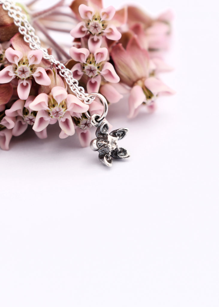 This sterling silver necklace, crafted by talented jeweler Lucie V, features as its main element a very precise casting of a common milkweed flower, the same plant from which we extract the insulating silk for our textile products.