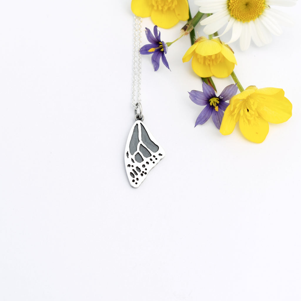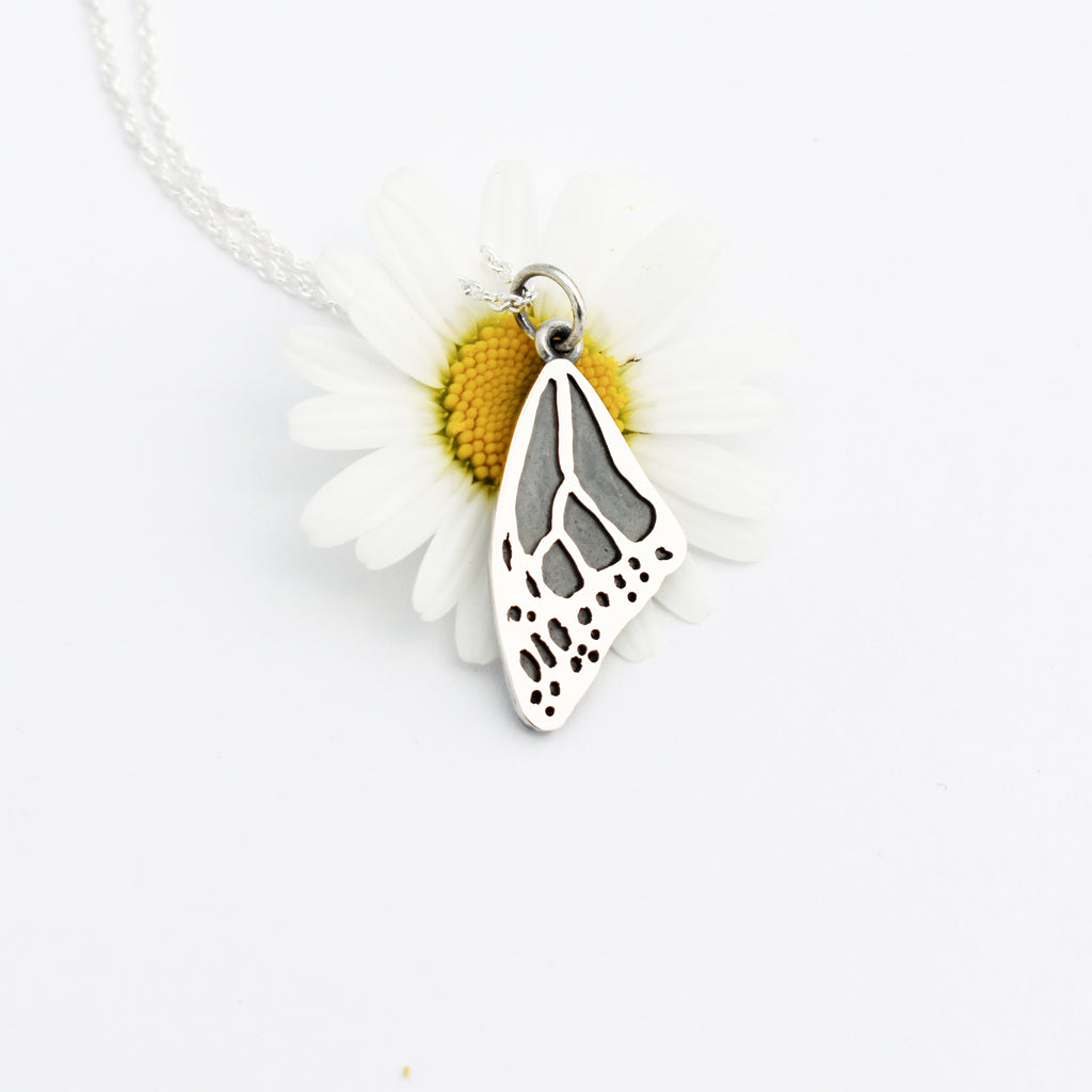 This sterling silver necklace, crafted by talented jeweler Lucie V, features as its main element a miniature version of a monarch butterfly wing, the emblematic insect whose conservation has become one of our main company missions, alongside the popularization of milkweed silk insulation.